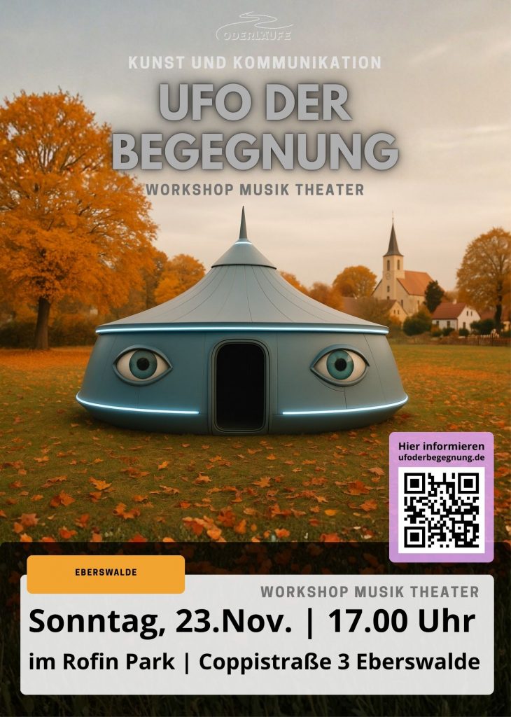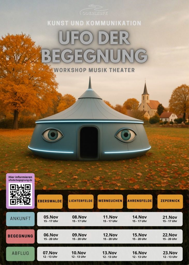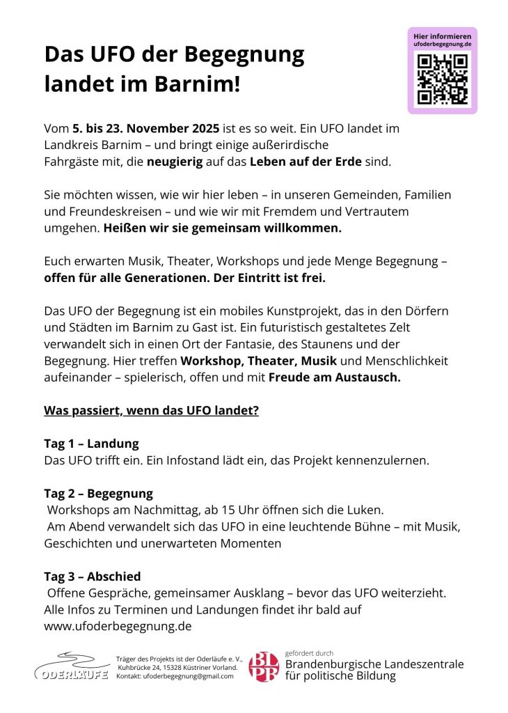 Im November 2025 landet das UFO der Begegnung an verschiedenen Orten im Barnim – mit Theater, Musik, Workshops und vielen Möglichkeiten zum Mitmachen. Drei Tage lang verwandeln sich Dorfplätze in Räume voller Licht, Klang und Begegnung.